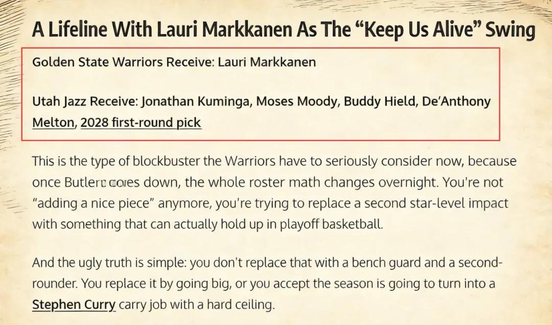 美媒《Fadeaway World》撰文建议,勇士可以将库明加、穆迪、希尔德、梅尔顿以及2028年的首轮签打包送往爵士,换回全明星前锋马尔卡宁。